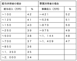 具体的には、総収入(給与所得者であれば源泉徴収票の支払金額、事業所得者についてはこちらのコラム参照)に以下の表の割合をかけて算出します。